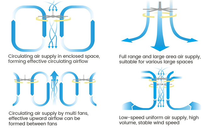 通過強(qiáng)烈的空氣攪動形成循環(huán)氣流場,進(jìn)而產(chǎn)生大型模擬自然風(fēng)系統(tǒng),加速大空間內(nèi)的空氣流通,大大提高環(huán)境舒適度。